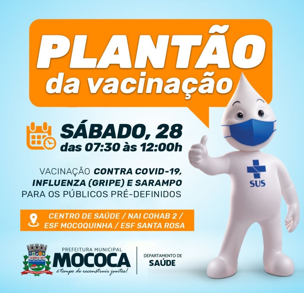 O Departamento de Saúde da Prefeitura Municipal de Mococa realiza neste sábado, 28, o Plantão da Vacinação das 07:30 às 12:00h. Neste dia, o Centro de Saúde, NAI COHAB 2, ESF Mocoquinha e ESF Santa Rosa estarão abertos para aplicarem doses de vacinas contra COVID-19, Influenza (Gripe) e Sarampo. Confiram os públicos pré-determinados:
