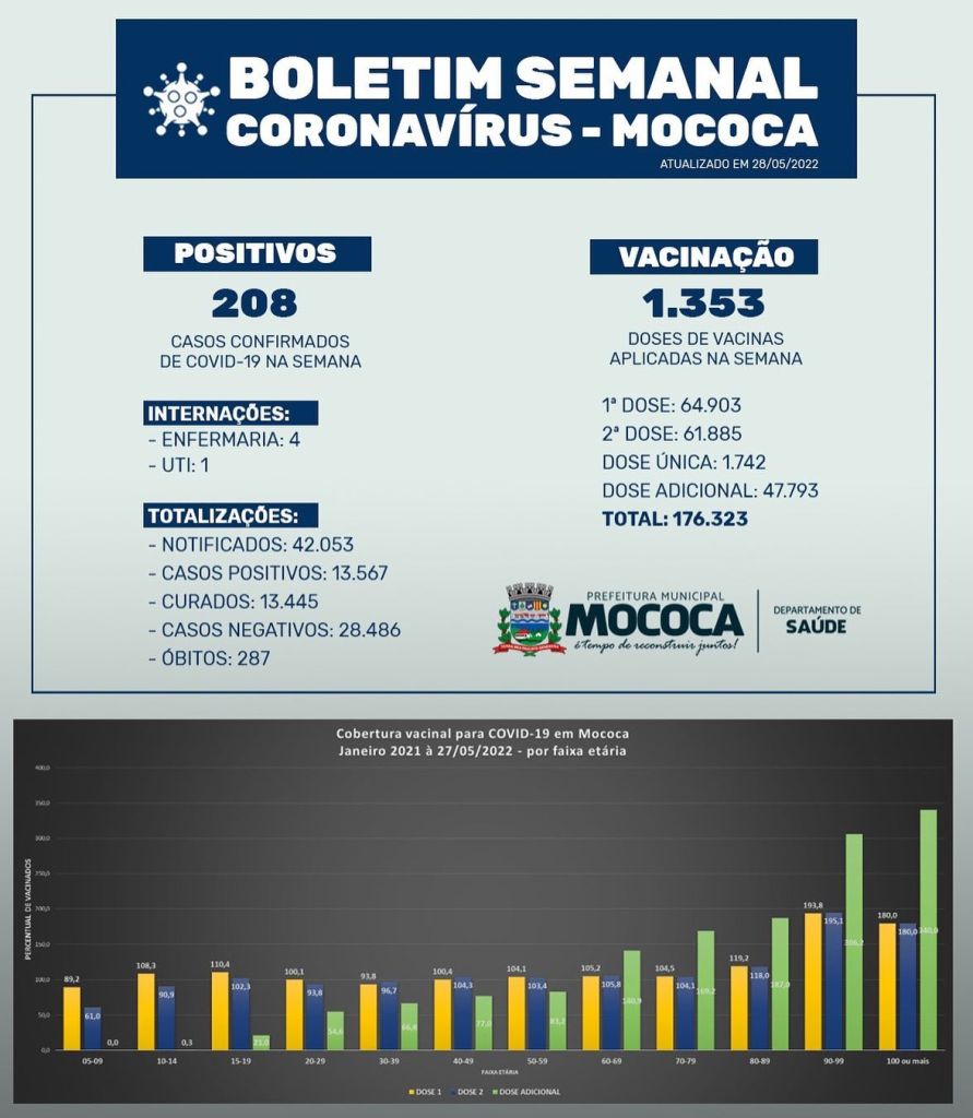 De acordo com a Vigilância Epidemiológica foram registrados 208 novos casos de COVID-19 no intervalo de uma semana em Mococa. Quatro pacientes estão internados na enfermaria da Santa Casa de Misericórdia de Mococa e um paciente idoso está internado na UTI do Centro de Referência Regional. Foram aplicadas 1.353 doses de vacinas contra o coronavírus no município no período.