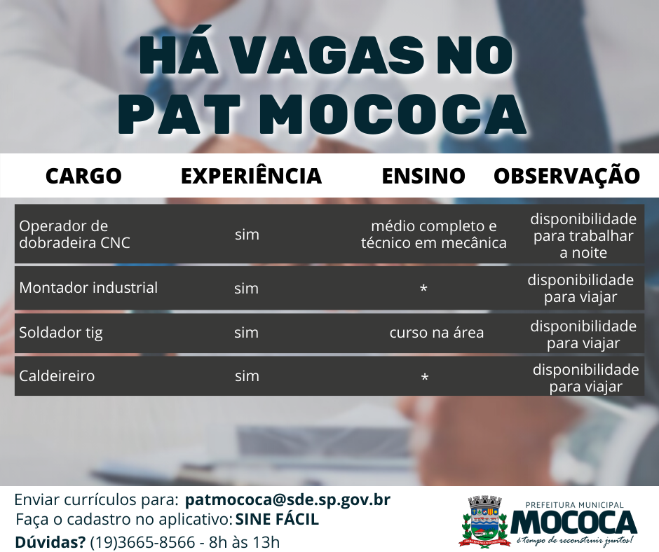Confira as vagas disponíveis no PAT - Posto de Atendimento ao Trabalhador de Mococa.