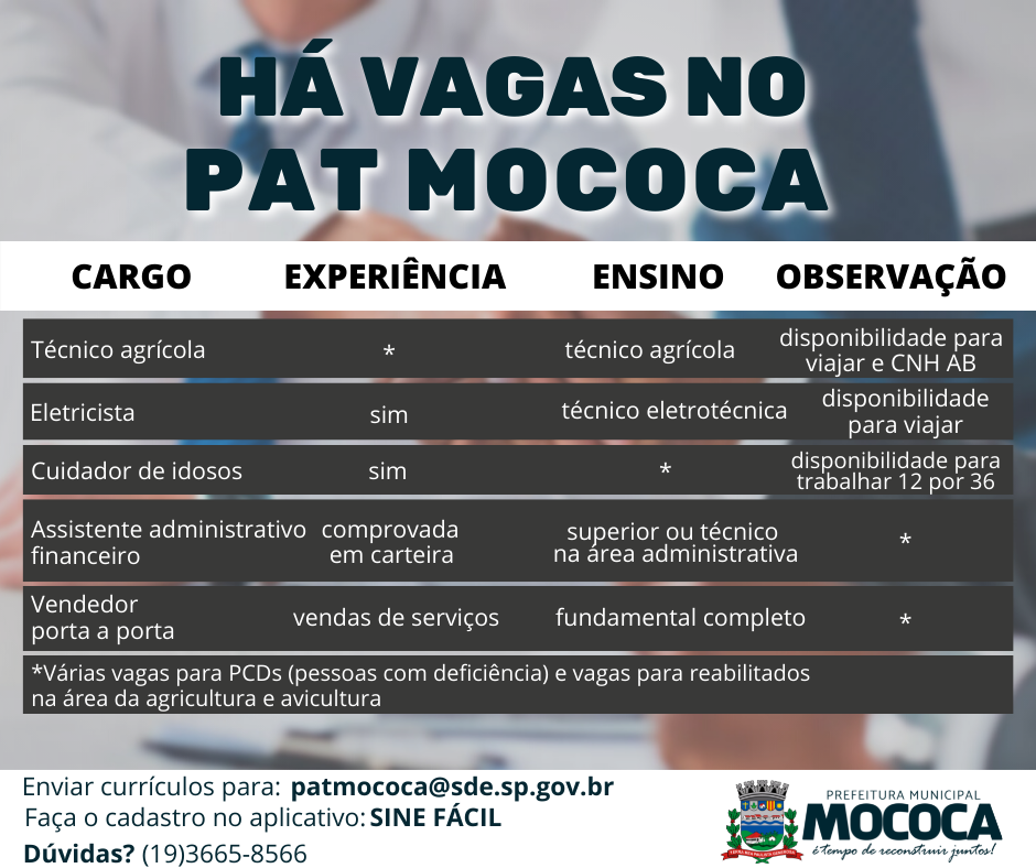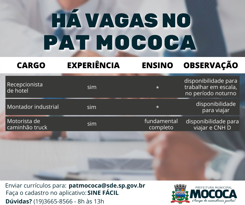Os interessados, deverão enviar currículos para o PAT- Posto de Atendimento ao Trabalhador no e-mail: patmococa@sde.sp.gov.br