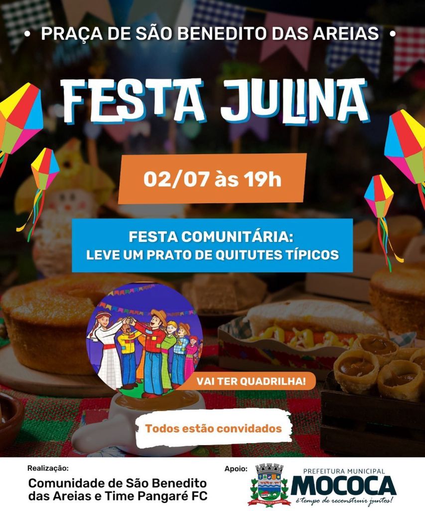 A Prefeitura Municipal de Mococa por meio da Administração de São Benedito das Areias convida a toda a população para a Festa Julina comunitária do distrito promovida pela comunidade e pelo time Pangaré Futebol Clube.