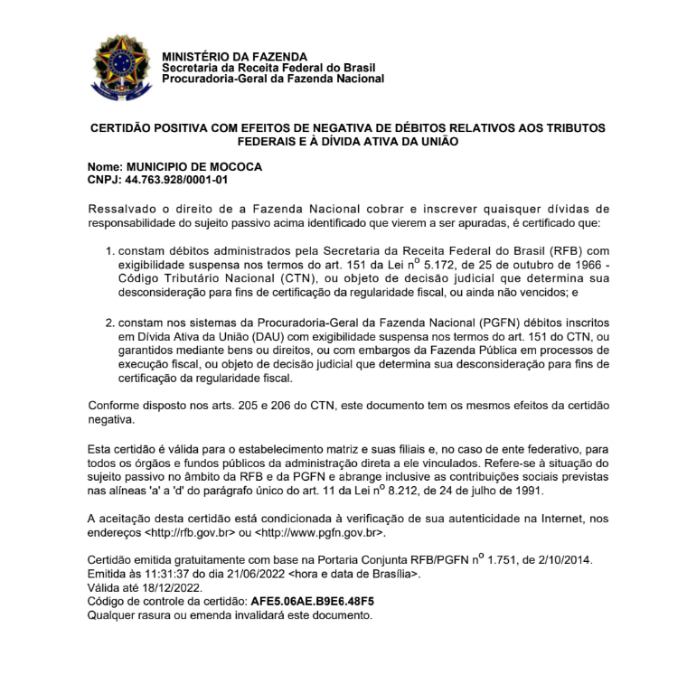 O Departamento Financeiro da Prefeitura Municipal de Mococa anunciou na tarde de ontem 21, a renovação da Certidão Negativa de Débitos (CND) junto à Receita Federal.