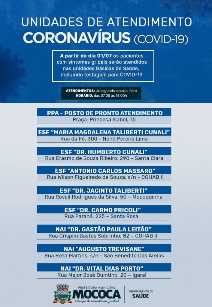 A partir de sexta-feira, 01, a Prefeitura Municipal de Mococa irá ampliar os atendimentos de pacientes com sintomas gripais e testagem de COVID-19 exclusivamente nas Unidades de Saúde do Município. Ao todo serão nove unidades, incluindo os Distritos de Igaraí e São Benedito das Areais, que receberão o fluxo de pacientes que apresentarem sintomas gripais para o atendimento. É importante ressaltar a obrigatoriedade do uso de máscara nos estabelecimentos de saúde. A testagem seguirá o protocolo, destinado a pacientes sintomáticos