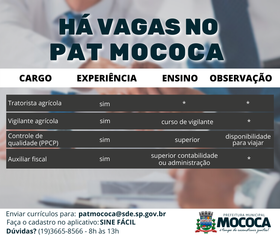 Confira as vagas disponíveis no PAT - Posto de Atendimento ao Trabalhador de Mococa.