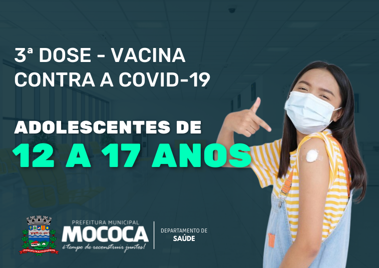 A Prefeitura Municipal de Mococa através do Departamento de Saúde convoca os adolescentes de 12 a 17 anos para aplicação da 3ª dose da vacina contra a COVID-19.