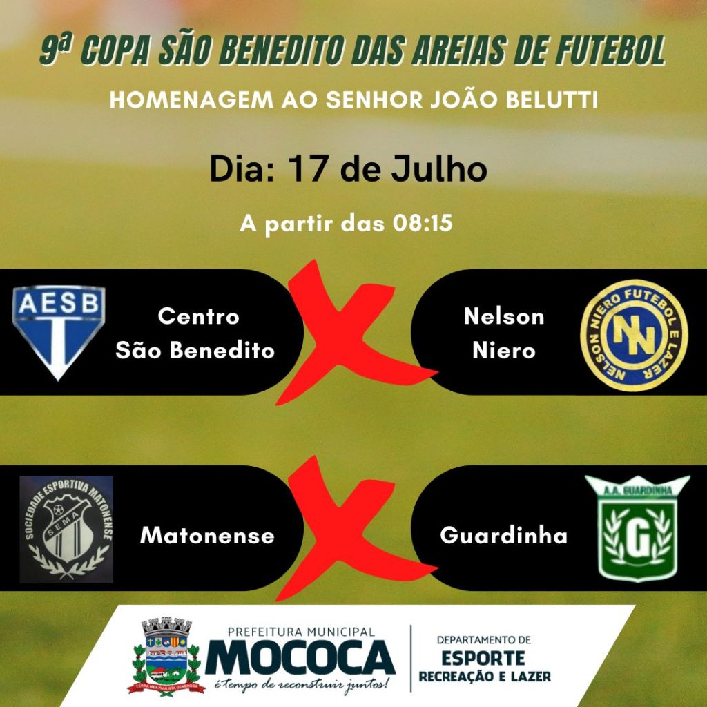 Atenção amantes do futebol: Neste domingo, 17 de julho, tem a 9ª Copa São Benedito das Areias de Futebol, em homenagem ao senhor João Belutti. A partir das 8horas.