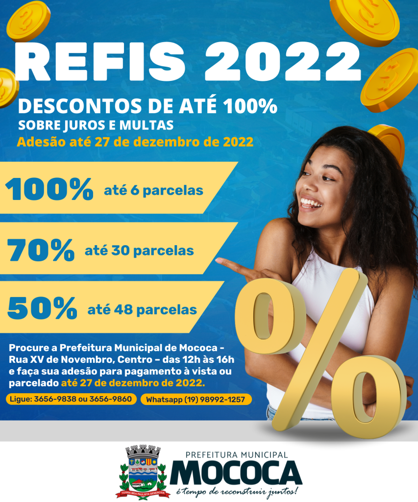 A Prefeitura Municipal de Mococa está lançando o REFIS 2022 – o Programa de Incentivo de Regularização Fiscal. Negociação de dívidas, impostos e taxas.