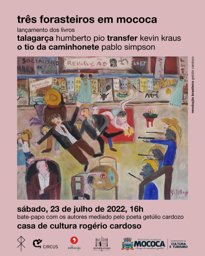 Na tarde deste sábado, 23 de julho às 16h, acontecerá na Casa de Cultura “Rogério Cardoso”, a tarde de autógrafos “Três Forasteiros em Mococa” com os autores Humberto Pio, Kevin Kraus e Pablo Simpson e um bate-papo, com mediação do decano poeta da cidade Getúlio Cardoso.