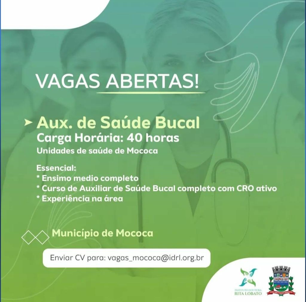 O Instituto Doutora Rita Lobato está contratando Auxiliar de Saúde Bucal, para atuar nas unidades de saúde municipais de Mococa.