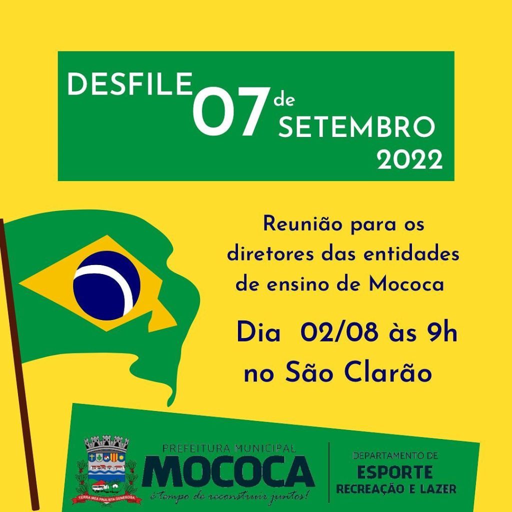 O Departamento de Esportes da Prefeitura Municipal de Mococa convida as entidades de ensino do município para participarem de uma reunião para tratar assuntos sobre o Desfile de Tradicional de 07 de Setembro – amanhã, dia 02 de agosto, às 9horas no ginásio São Clarão.