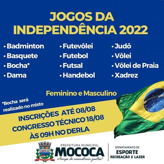 O Departamento de Recreação, Esporte e Lazer de Mococa, inicia inscrições para os Jogos de Independência 2022.