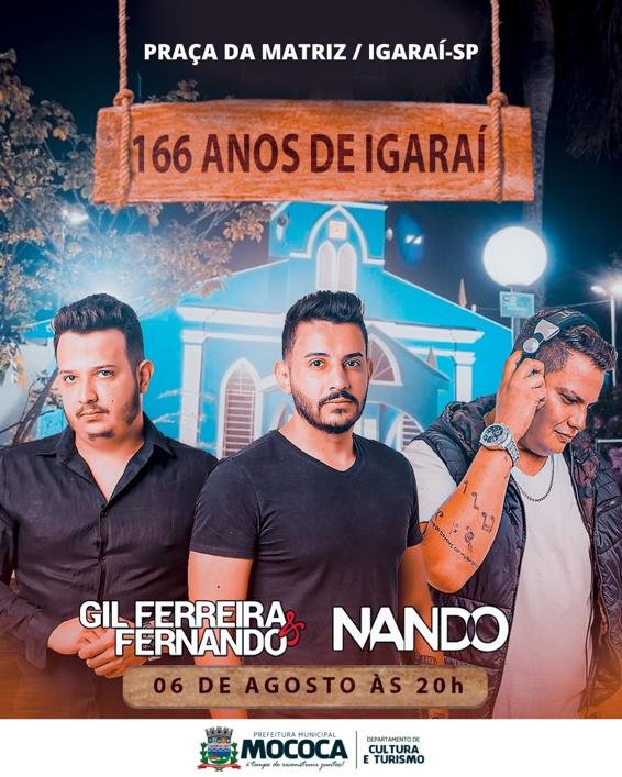 A Prefeitura Municipal de Mococa realizará um show em comemoração aos 166 anos do Distrito, será no dia 06 de agosto às 20h, com a dupla Gil Ferreira & Fernando e Dj Nando, na Praça da Matriz em Igaraí.