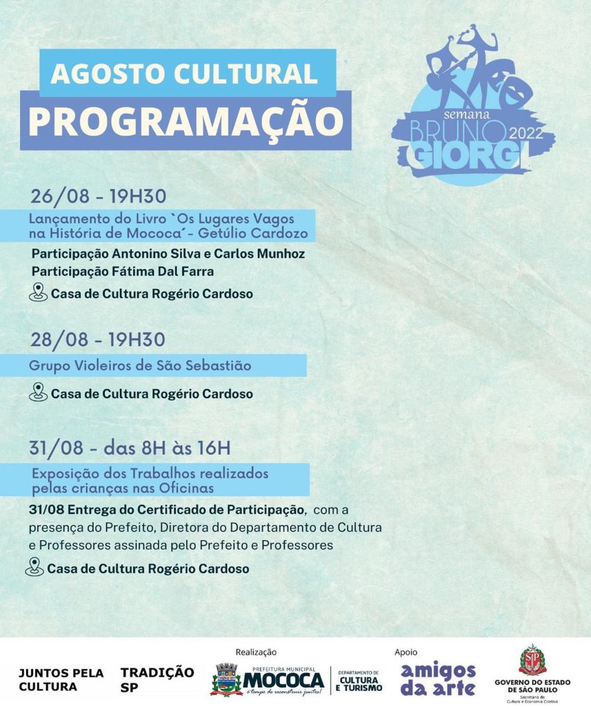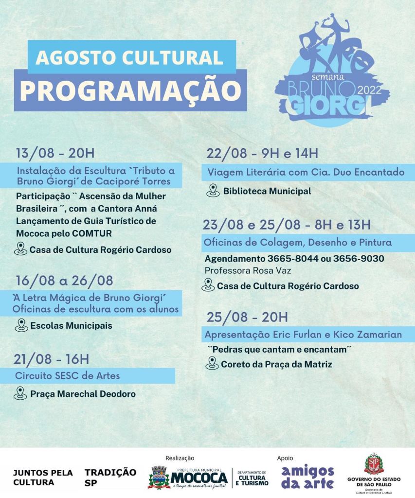 O Departamento de Cultura e Turismo da Prefeitura Municipal de Mococa celebra a 22ª edição da Semana Bruno Giorgi.