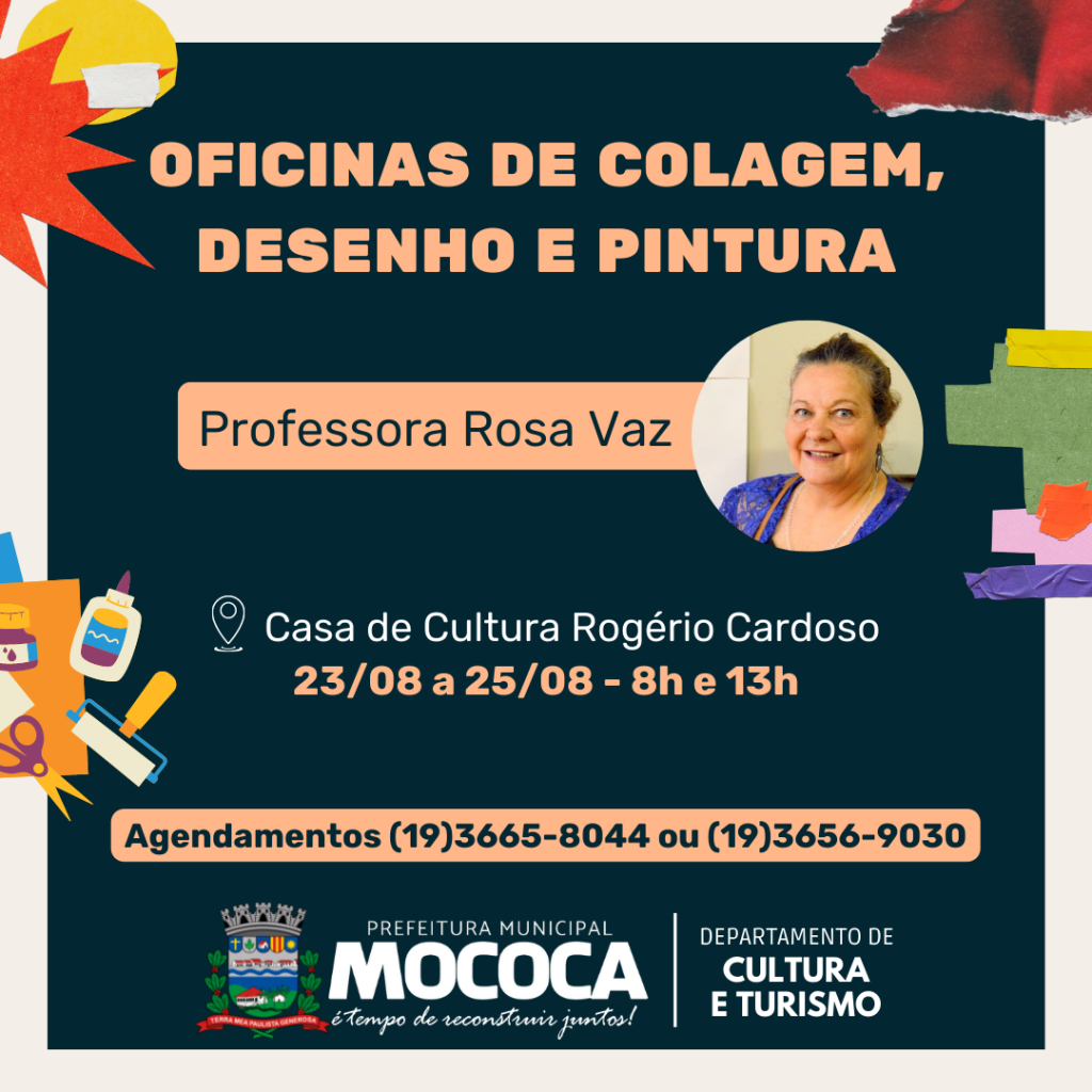 Continuando o mês de agosto cultural, o Departamento de Cultura e Turismo da Prefeitura Municipal de Mococa, convida o público à partir de 8 anos para participar da Oficina de Colagem, Desenho e Pintura, com a Professora Rosa Vaz, nos dias 23/08 a 25/08, com horários 08h e 13h, na Casa de Cultura “Rogério Cardoso”.