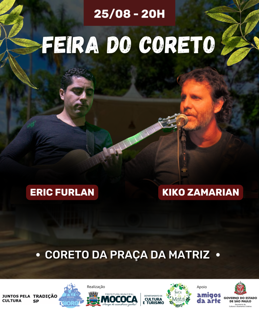 Em comemoração a semana Bruno Giorgi, o Departamento de Cultura e Turismo da Prefeitura Municipal de Mococa em parceria com a Feira da Mata, apresenta o show de Eric Furlan e Kiko Zamarian no dia 25/08 às 20h na Feira do Coreto.