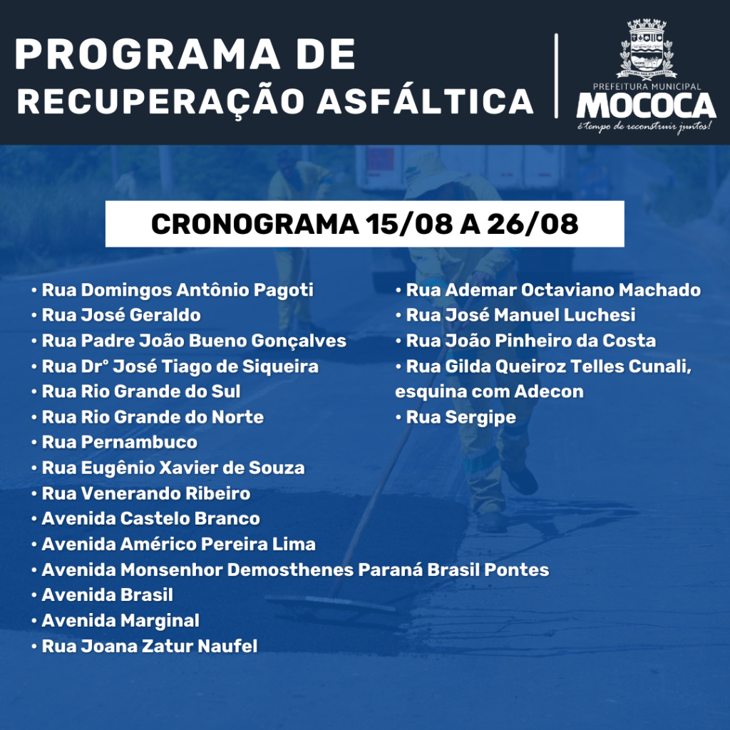 Durante essa semana até o dia 26/08 o Programa de Recuperação Asfáltica estará nas seguintes ruas: