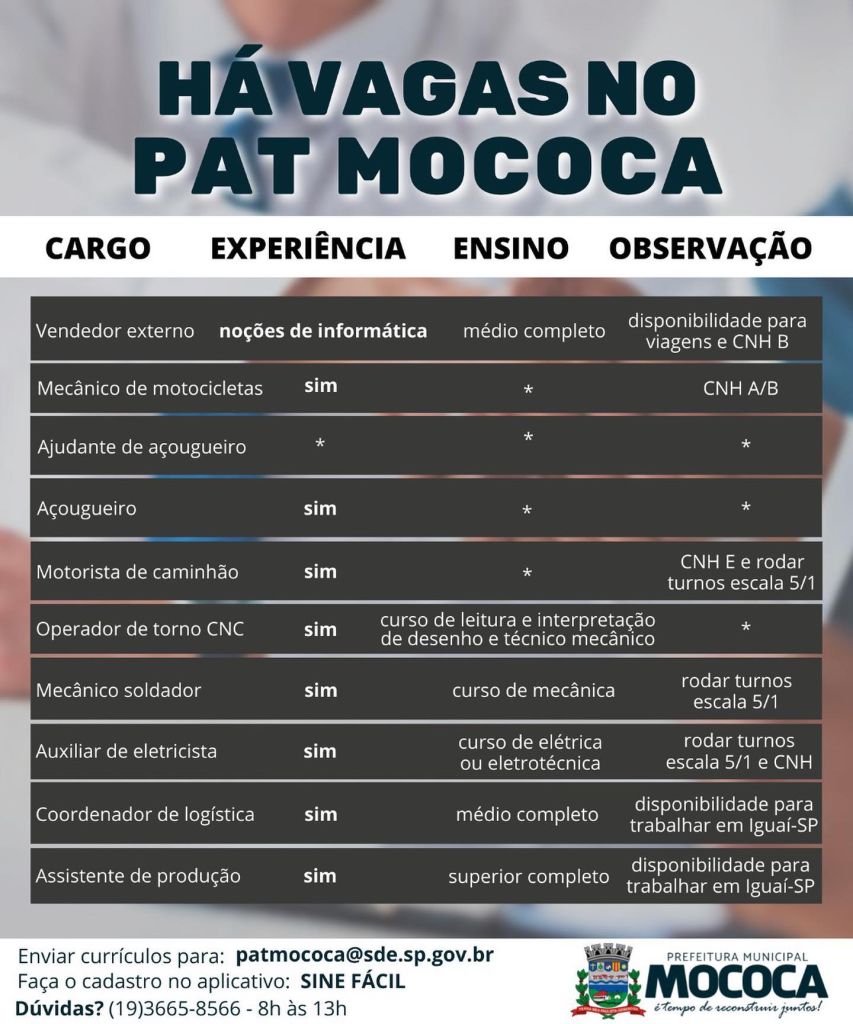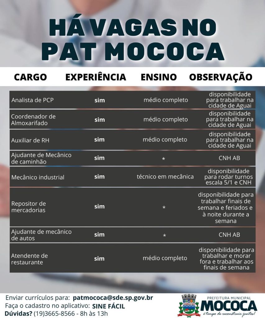 Os interessados, deverão enviar currículos para o PAT- Posto de Atendimento ao Trabalhador no e-mail: patmococa@sde.sp.gov.br